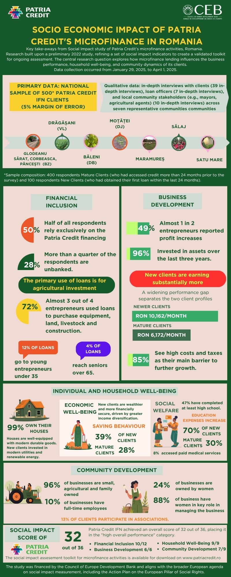 “This study confirms what we see every day in the field: access to finance transforms lives and communities,” said Raluca Andreica, CEO of Patria Credit IFN. “Our clients are building stronger businesses, sending their children to higher education, and shaping a more resilient rural Romania. At Patria Credit, we are proud to expand opportunities where they are needed most.”